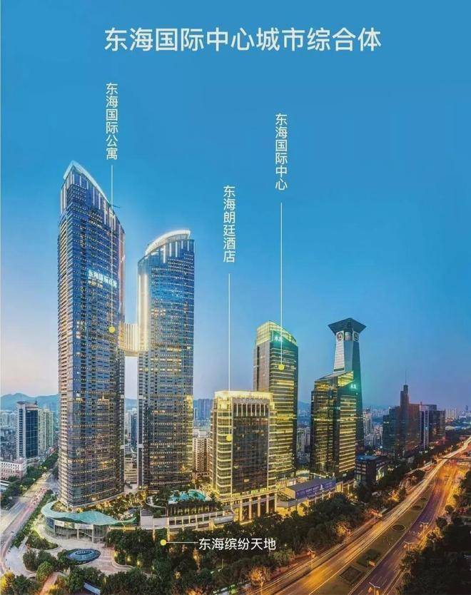东海国际中心项目由办公楼、酒店、商务公寓、商业四大部分组成;是现今深圳深南大道两旁最大的综合建筑群,其中办公楼2幢,高度约为190米/150米;酒店1座,约为100米;商务公寓2幢,高度约为300米/255米;还有约65365平方米的商业。