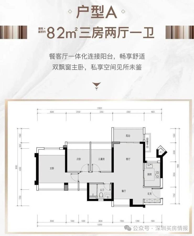 82㎡三房一卫,有通透和竖厅两种户型,均为东北朝向。