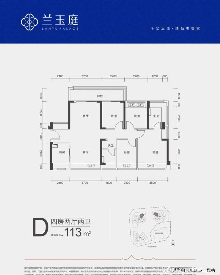 113㎡的4房2厅2卫,D户型,设计的是竖厅南北通透格局,客厅开间3.7米,4个卧室分别做到了3.5米/2.7米/2.7米/2.4米的宽度,客厅连接次卧出6.4米长的大阳台,U型厨房,公卫三段式分离,得房率约79%(不含赠送),阳台主朝西北或东北向。