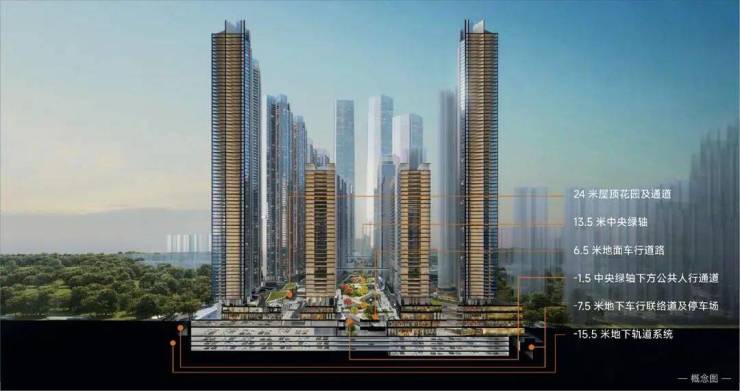 创新打造地上地下六重结构立体化交通系统,不同交通系统分层互联,人行系统、城市公共道路系统,地下轨交系统快速接驳,最大程度实现人车分流,科学化疏解交通压力。