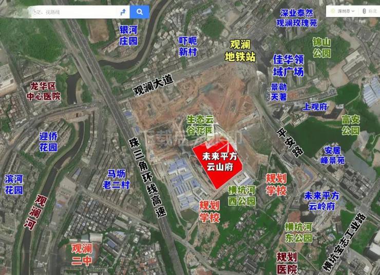 鸿荣源观城,位于深圳龙华区观澜核心地带,隶属鹭湖中心城,被定位为深圳市级功能中心,与北站国际商务区共同构成龙华“双中心”发展格局。项目毗邻地铁4号线观澜站(直线距离约400米),处于龙华六大重点发展片区之一的鹭湖中心区,北临观澜大道,西邻梅观高速,南近安元大道,东靠富澜路。