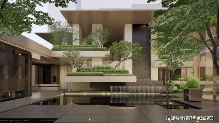 【自然水岸游泳池】:约400㎡无界亲子多元互动型泳池,与7栋架空层联动,在架空层内布置淋浴更衣、消毒池等功能,与周边绿化融合,无硬边界,绿植做隔断,旁边设置跌水景观。