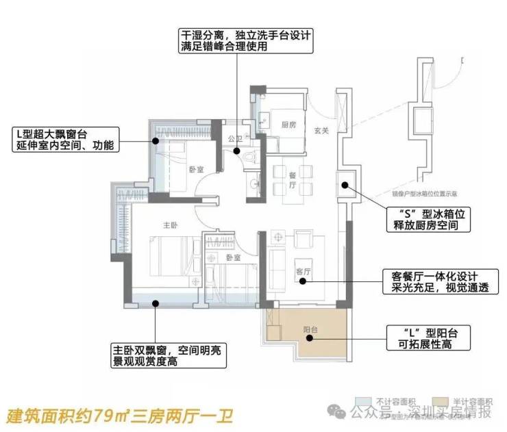 建筑面积约79㎡户型是该项目打造的主力作品,采用LDKB一体化设计、配备L型大阳台、7个飘窗;预留入户玄关位、S形冰箱位,均嵌入式设计,空间化零为整;还合理利用厨房的飘窗台,打造U形厨房;卫生间采用三分离设计,不仅实现干湿分离更卫生,使用效率也更高,满足三代同住的需求。