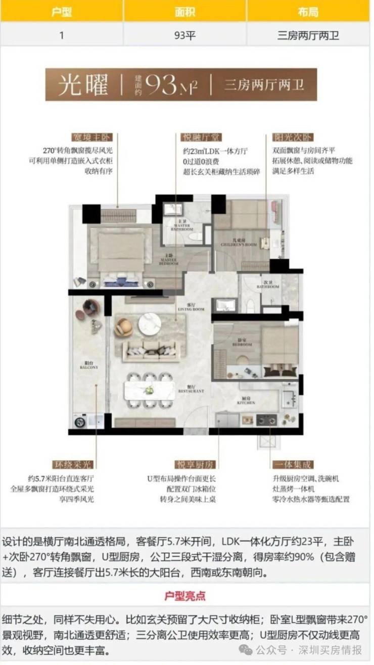 93㎡的3房2厅2卫,2栋1/2/3单元01户型,设计的是横厅南北通透格局,客餐厅5.7米开间,LDK一体化方厅约23平,主卧+次卧270°转角飘窗,U型厨房,公卫三段式干湿分离,得房率约90%(包含赠送),客厅连接餐厅出5.7米长的大阳台,西南或东南朝向。