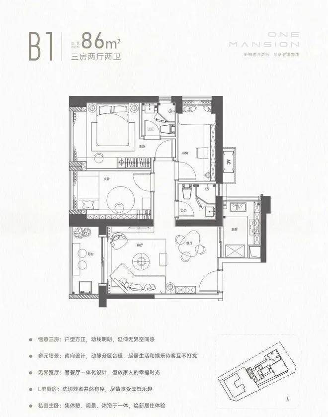 设计的经典竖厅格局,客厅3.6米开间,餐客厅一体化设计,三开间朝南,3个卧室分别做到了3.3米/2.9米/2.7米的宽度,L型厨房,得房率72.47%(不含赠送),东南朝向。
