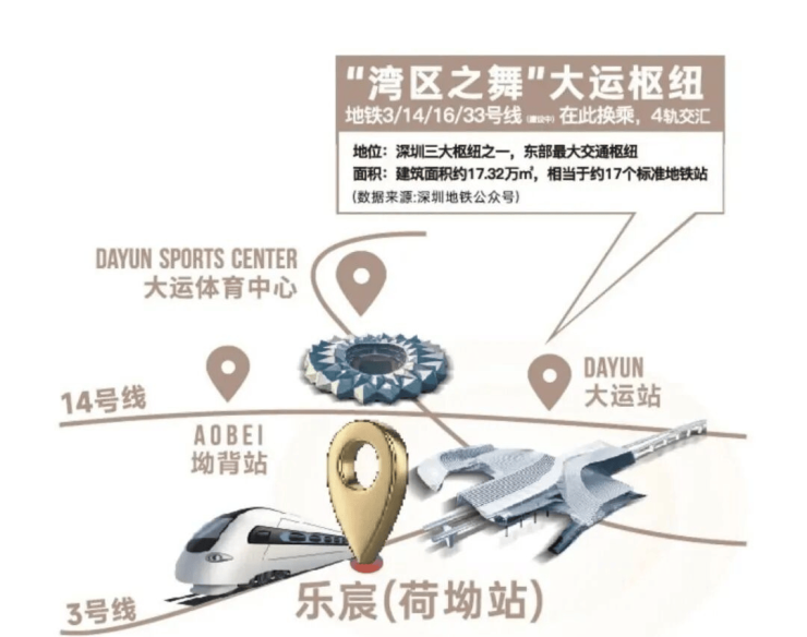 乐宸择址大运新城,以擎动东部的时代坐标之姿,立序湾东智芯。大运新城又定义为大运深港国际科教城,与前海、深圳湾、香蜜湖等区域并称深圳六大城市新客厅,汇聚东部最大综合交通枢纽。区域引进NBA中国赛、当红明星演唱会,深圳国际大学城落户,带动高能级配套激增,造就从容进阶的生活质感。