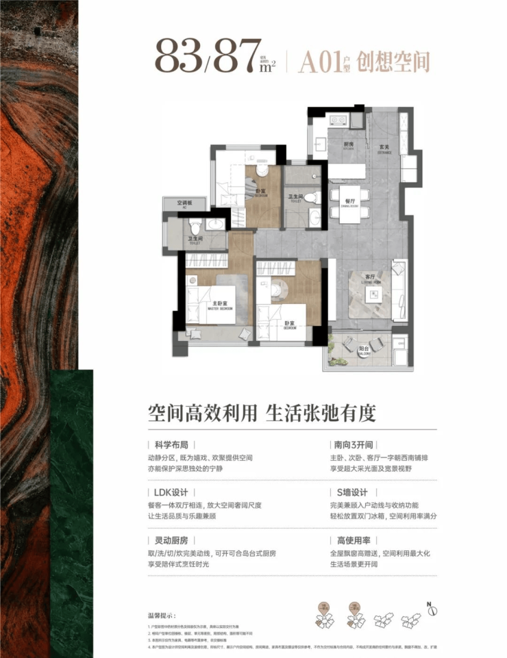 83-87平:3房2厅2卫,套内净使用率在80%,西南朝向