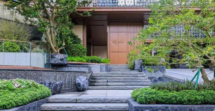 小区是往现代高端社区方向打造,步行大门是山林水石设计,而车行出入口则设计了酒店级回旋处落客区,跟「胤璞」很像。