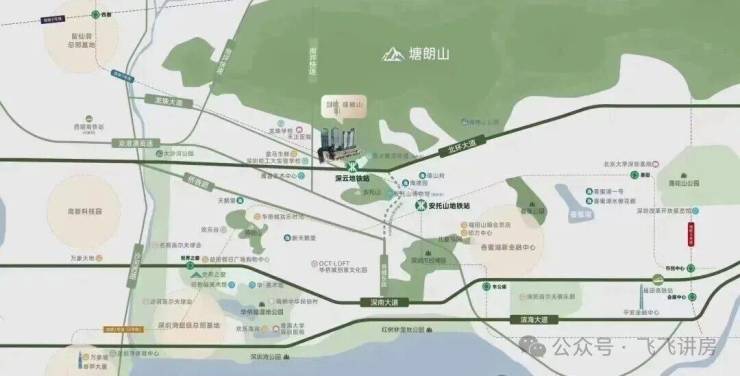 项目地址位于深圳市南山区桃源北环大道北侧塘朗山南麓,邻近深云地铁站。项目大体被山体包裹,西侧和南侧分别临近南坪快速路、北环大道两条城市快速路,其东侧还将建设侨城东路北沿线(规划中),所处片区相对割裂存在。