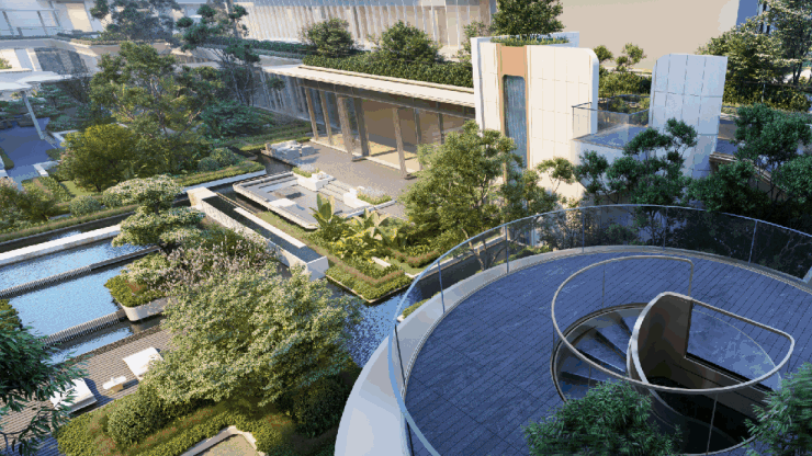 建筑之下,约2.5万㎡的“碧海森屿松弛谧境”主题园林是未来社区生活的核心载体,相较整个项目约4.16万㎡占地,过半的园林占地不仅给项目方提供了更大施展空间,也给未来社区预留了更多场景可能。