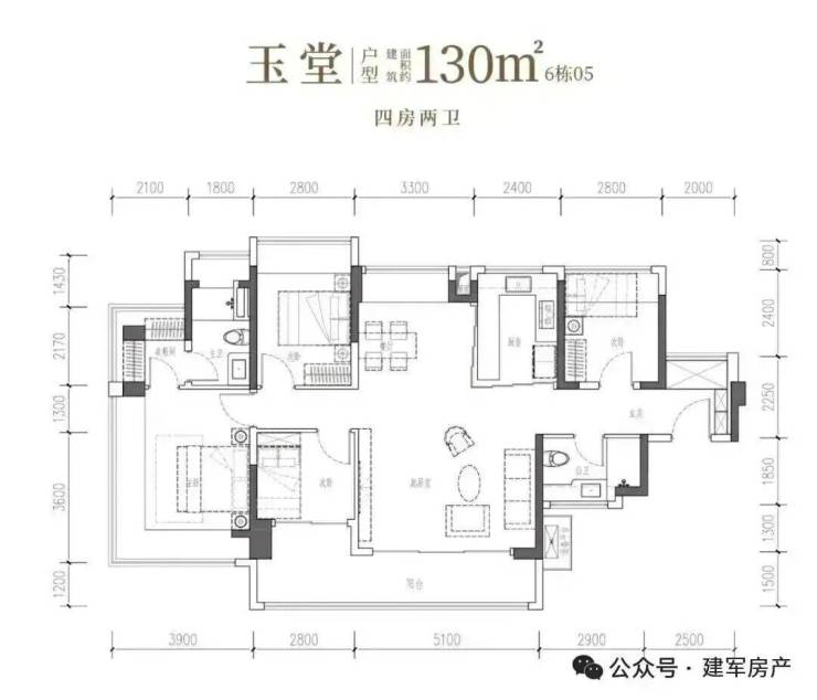130㎡的4房2厅2卫,设计的是竖厅南北通透格局,进门独立玄关,客厅5.1米开间,客餐厅分离化设计,主卧270°无柱转角飘窗+衣帽间,分别做到了主卧23.66㎡/次卧11.2㎡/次卧8.96㎡/次卧7.84㎡(包含墙体飘窗),U型厨房烟道外置,卫生间干湿分离,得房率约101.95%(包含赠送),客厅连接次卧出超大阳台约14.09平,东北朝向。
