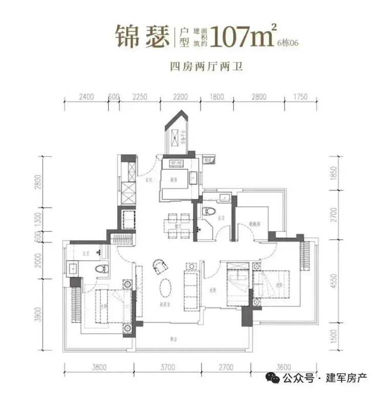 107㎡的4房2厅2卫,设计的是竖厅双龙抱珠格局,客厅3.7米开间,LDKB一体化设计,预留冰箱卡槽位,四开间朝南,主卧+2个次卧270°无柱转角飘窗,分别做到了主卧17.94㎡/次卧16.38㎡/次卧7.56㎡/次卧6.89㎡(包含墙体飘窗),U型厨房烟道外置,卫生间干湿分离,得房率约104.06%(包含赠送),客厅连接次卧出超大阳台约11.76平,东北朝向。