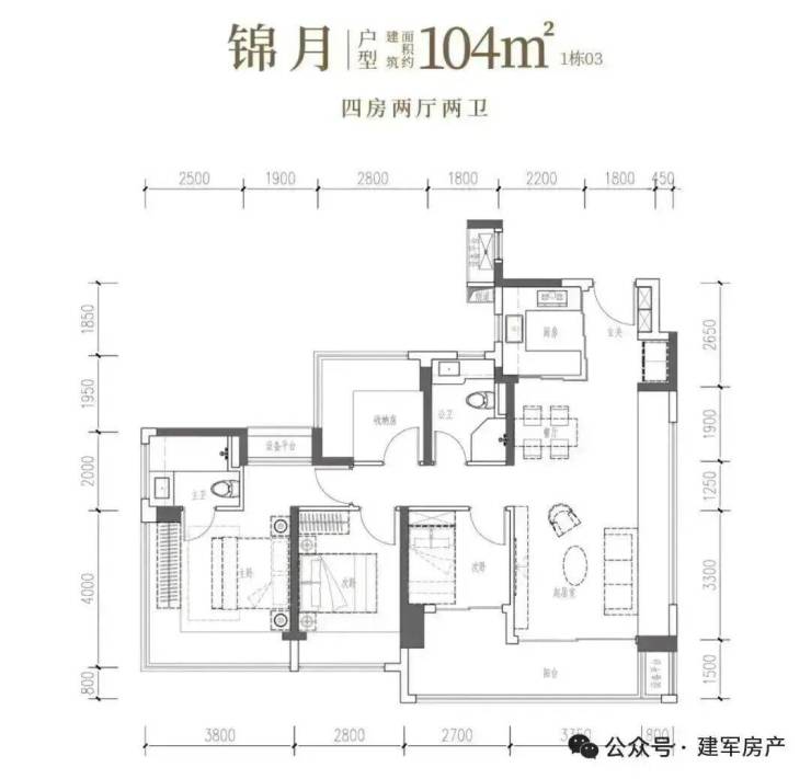 104㎡的4房2厅2卫,设计的是竖厅格局,客厅4.15米开间,LDKB一体化设计,预留冰箱卡槽位,四开间朝南,动静分区,主卧270°无柱转角飘窗还带1个设备平台约1.52平,分别做到了主卧20.34㎡/次卧11.2㎡/次卧7.7㎡/次卧6.75㎡(包含墙体飘窗),U型厨房烟道外置,卫生间干湿分离,得房率约100.71%(包含赠送),客厅连接次卧出大阳台约11.23平,西南朝向。