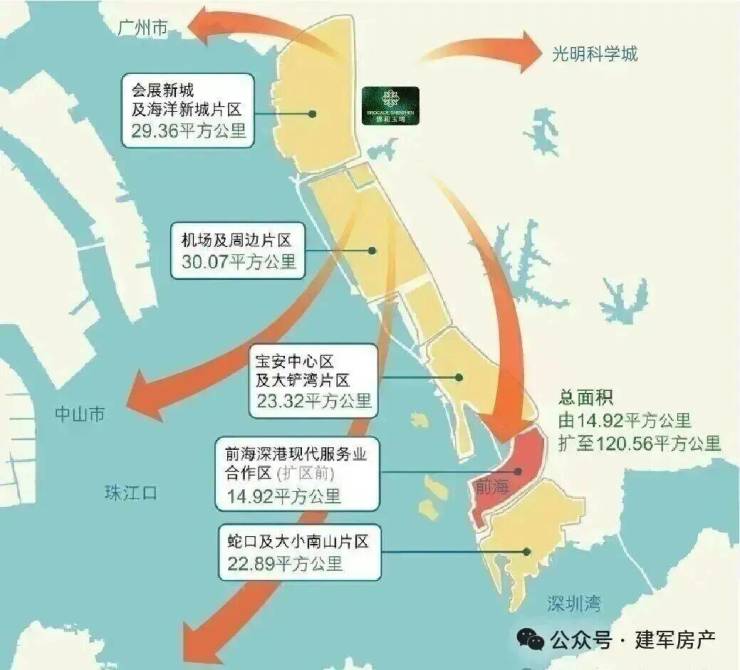 前海展翼:宝安作为湾区发展的桥头堡和主力军,深挖城市发展潜力,明确三城发展目标在前海“扩区”重磅落地之后,宝安1/5的范围加入前海,前海2/3的范围落在宝安,宝安一跃成为国家战略主战场。