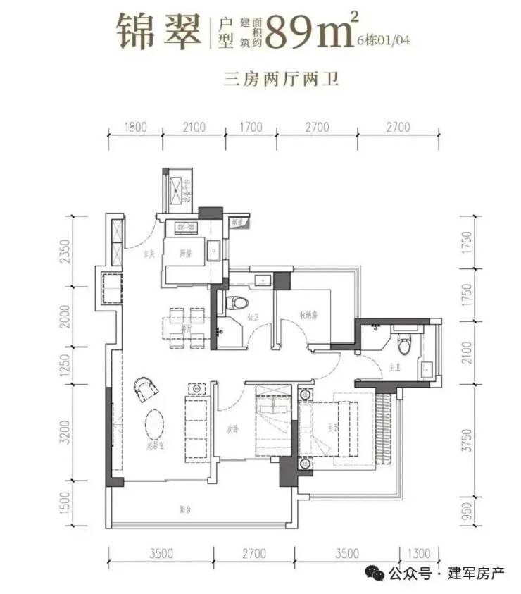 89㎡的3房2厅2卫,6栋01/04户型,设计的是经典竖厅格局,客厅3.5米开间,LDKB一体化,S墙设计预留冰箱卡槽位,三开间朝南,动静分区,主卧+次卧270°无柱转角飘窗,分别做到了主卧15.25㎡/次卧7.56㎡/次卧6.48㎡(包含墙体飘窗),U型厨房烟道外置,卫生间干湿分离,得房率约97.47%(包含赠送),客厅连接次卧出大阳台约11.46平,西南或东南朝向。