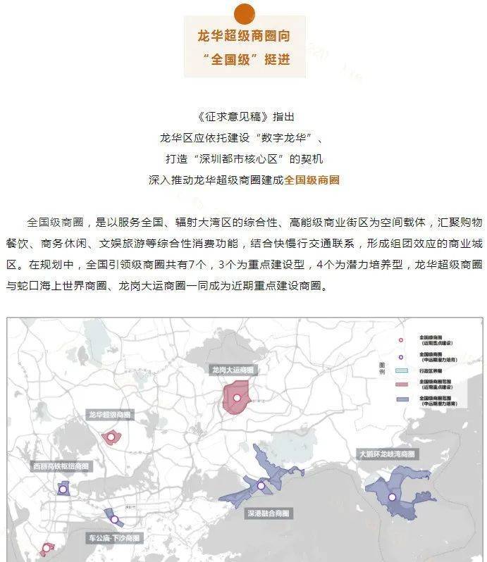 「 龙华超级商圈,世界级消费中心 」龙华超级商圈:龙华六大重点片区之一,以人民路为中轴,规划承载中洲龙商旧改、龙华海岸城旧改为核心,打造人民路龙华超级商圈,推动龙华超级商圈建成全国级商圈。
