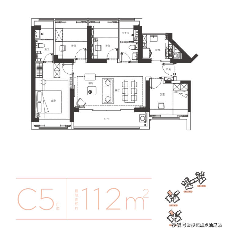 112㎡的4房2厅2卫,C5户型,1栋1/2单元02户型,设计的是横厅南北通透格局,进门入户玄关,LDKB一体化设计,四开间朝南,主卧大套间设计,全屋7面飘窗,客餐厅出大阳台,U型厨房,卫生间干湿分离,得房率约75%(不含赠送),阳台主朝西南向。