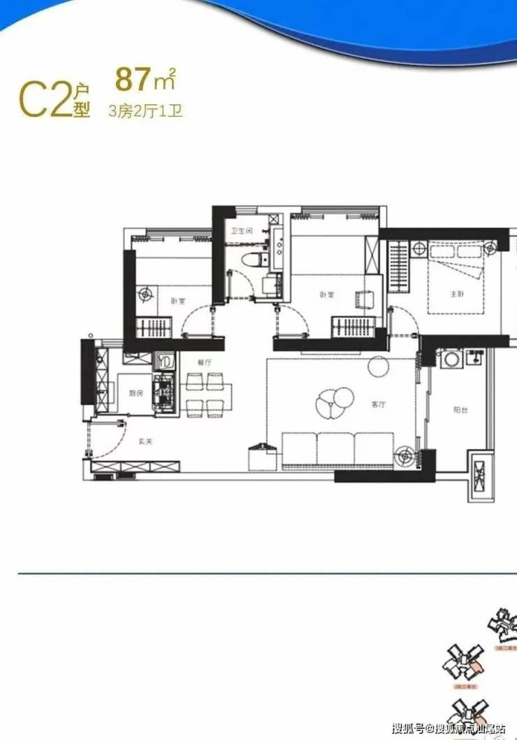 87㎡的3房2厅1卫:C2户型,1栋3/4单元06户型,设计的是竖厅格局,进门入户玄关,LDKB一体化设计,U型厨房,卫生间干湿分离,得房率约75%(不含赠送),东南朝向。