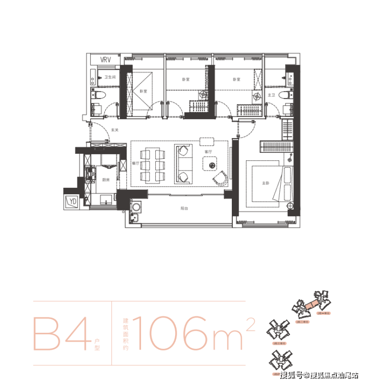 106㎡的4房2厅2卫,B4户型,1栋1/2单元05户型,设计的是横厅南北通透格局,进门入户玄关,LDKB一体化设计,四开间朝南,主卧大套间设计,全屋7面飘窗,客餐厅出大阳台,U型厨房,卫生间干湿分离,得房率约72%(不含赠送),阳台主朝东南向。