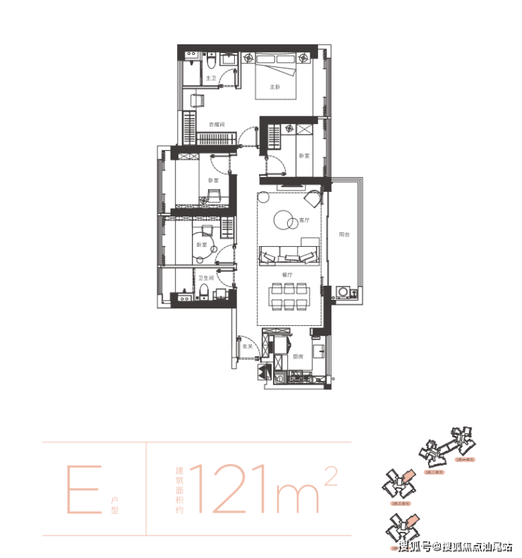 121㎡的4房2厅2卫,E户型,1栋1/2单元01户型,设计的是横厅南北通透格局,进门入户玄关,LDKB一体化设计,五开间朝南,主卧大套间设计,全屋6面飘窗,客餐厅出大阳台,U型厨房,卫生间干湿分离,得房率约75%(不含赠送),阳台主朝西南向。
