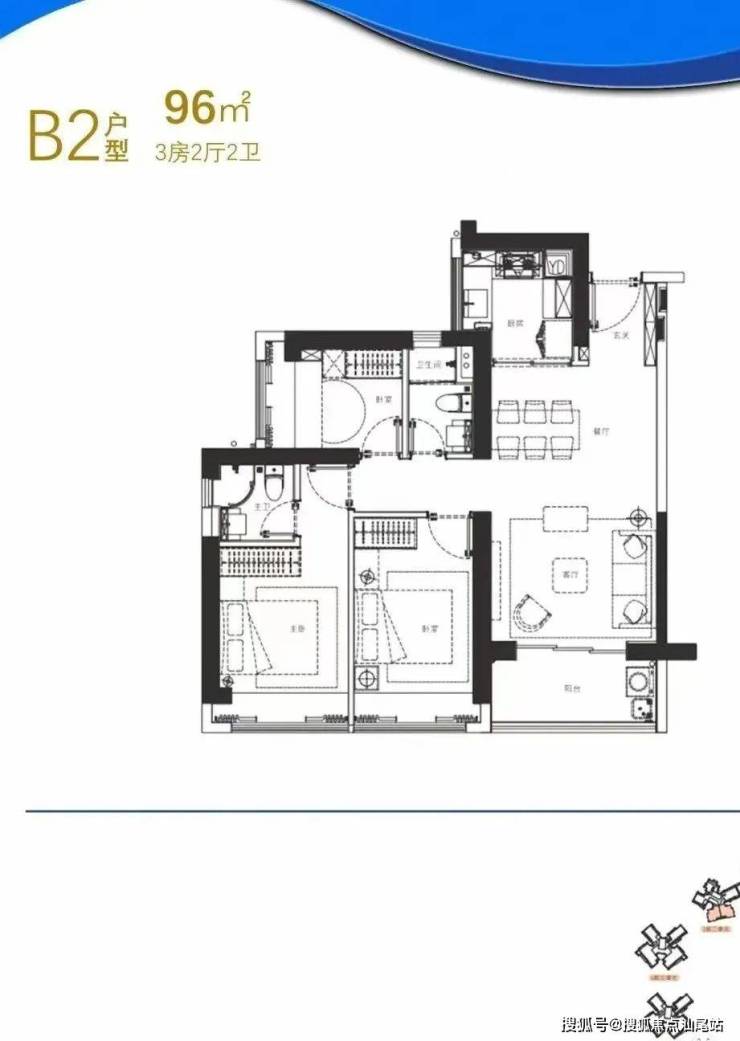 96㎡的3房2厅2卫,B2户型,1栋1/2单元03.04户型,设计的是经典竖厅格局,进门入户玄关,LDKB一体化设计,动静分区,三开间朝南,U型厨房,卫生间干湿分离,得房率约72%(不含赠送),东南朝向。