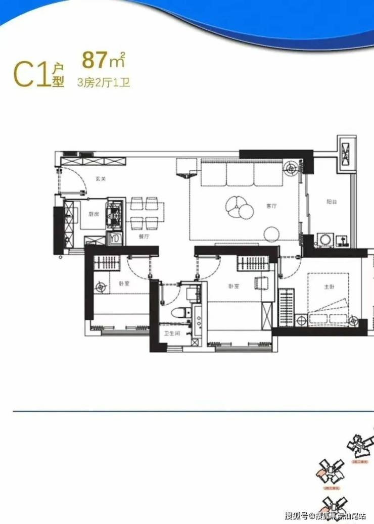 87㎡的3房2厅1卫:C1户型,1栋3/4单元03户型,设计的是竖厅格局,进门入户玄关,LDKB一体化设计,U型厨房,卫生间干湿分离,得房率约75%(不含赠送),西南朝向。