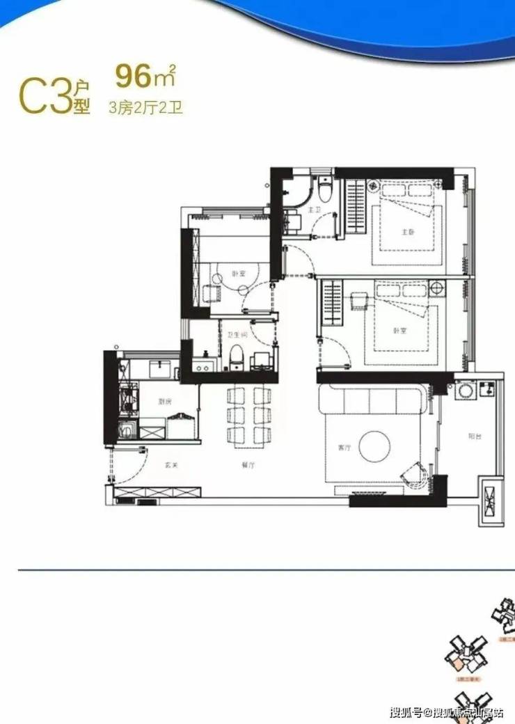 96㎡的3房2厅2卫,C3户型,1栋3/4单元05户型,设计的是经典竖厅格局,进门入户玄关,LDKB一体化设计,动静分区,三开间朝南,U型厨房,卫生间干湿分离,得房率约75%(不含赠送),西南朝向。
