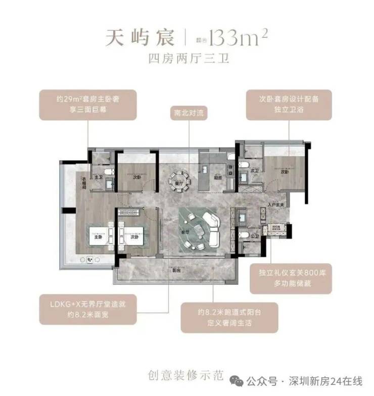 133㎡的4房2厅2卫,设计的是竖厅南北通透格局,进门入户玄关,客厅5.4米开间,餐客厅分离设计,客厅连接次卧出12.3m²的观景大阳台,L型中式+岛台灵动式厨房,公卫三段式干湿分离,得房率约78.27%(不含赠送),阳台主朝东南或西南向。靓点:超大客餐厅南北对流+8.2米长超大观景南向阳台,超大主卧+270°无柱转角飘窗