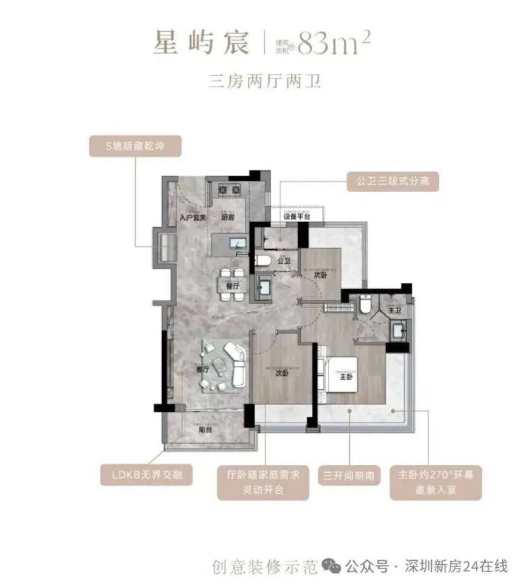83㎡的3房2厅2卫,设计的是经典竖厅格局,客厅3.35米开间,LDKB一体化,S墙设计预留双开门冰箱卡槽位,三开间朝南,动静分区,U型厨房,公卫三段式干湿分离,赠送1.98平设备平台,得房率约77.15%(不含赠送),阳台5.02m²西南或东南朝向。靓点:83平做到了3房2卫,主卧270°无柱转角飘窗,厨房烟道外置+额外赠送设备平台,并且是纯南向格局。