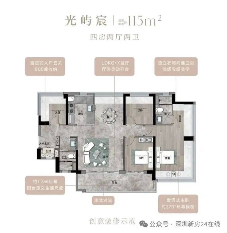 115㎡的4房2厅2卫,设计的是竖厅南北通透格局,进门入户玄关,客厅4.45米开间,餐客厅分离设计,客厅连接次卧出10.87m²的观景大阳台,L型中式+岛台灵动式厨房,公卫三段式干湿分离,得房率约78.27%(不含赠送),阳台主朝东南或西南向。靓点:南北对流+7.25米长超大观景南向阳台,超大主卧+270°无柱转角飘窗