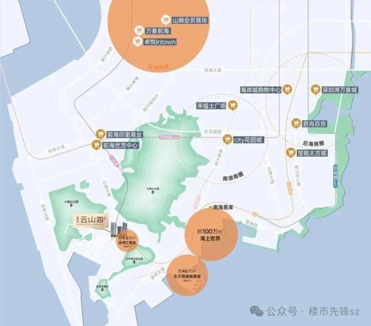 一路之隔有约4.6万㎡赤湾汇商业(建设中);直线距离约1.8公里享约46万㎡太子湾高端商业(建设中),如K11、兰桂坊等;距离约2.2公里抵达约100万㎡海上世界;2站距离抵达前海印里商业、前海世贸中心;6站距离抵达万象前海、前海卓越intown;7站抵达前海山姆会员商店等商圈;直线距离约6公里范围内分布有花园城、海岸城、宝能太古城、来福士广场等多个大型shoppingmall。