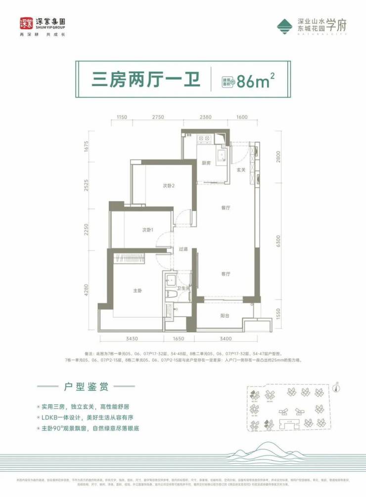 86㎡的3房2厅1卫,设计的是竖厅格局,进门入户玄关,客厅3.4米开间,LDKB一体化设计,3个卧室分别做到了3.43米/2.52米/2.25米的宽度,L型厨房,卫生间干湿分离,得房率:75%(不含赠送),西南、东南或西北向。