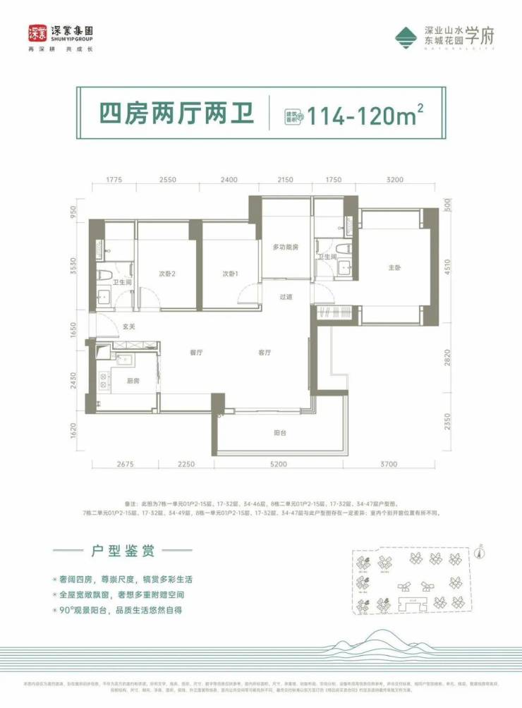 114-120㎡的4房2厅2卫,设计的是横厅南北通透格局,客餐厅一体化,4个卧室分别做到了3.2米/2.55米/2.4米/2.15米的宽度,主卧南北通透,5.2米长的L型大阳台,U型厨房,卫生间干湿分离,得房率:75%(不含赠送),阳台主朝东南向。