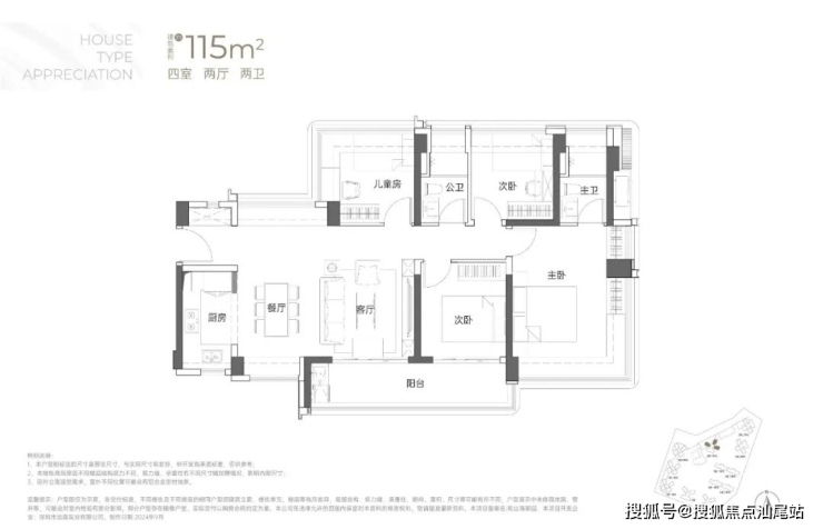 115㎡的4房2厅2卫:横厅南北通透格局,客餐厅6米开间,LDKB一体化,全屋飘窗,4个卧室分别做到了3.9米/3米/2.8米/2.6米的宽度,主卧加1个次卧270°全景飘窗,客厅出6米长的大阳台,L型厨房,得房率约95-97%(包含赠送),西南或东南朝向。115平米户型分布在1栋1单元、1栋2单元、1栋3单元01/02户型,01户型西南朝向都是看小区外围,02户型看向小区;