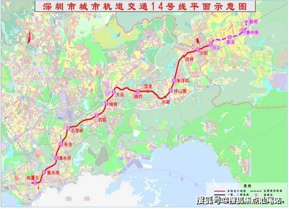 地铁14号线(建设中)起自福田中心区岗厦北枢纽,途径宝龙片区,止于坪山区沙田站。全线设站17座,线路全长约50.34km。起点预留延伸至会展中心条件,终点预留延伸至惠州条件。作为地铁快线,14号线(建设中)将采用自动化无人驾驶技术,最高设计速度为120公里/小时。
