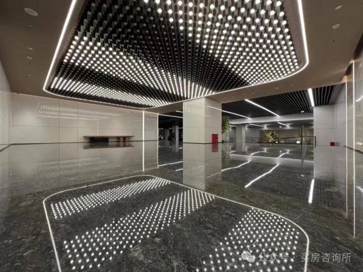 大堂——社区采用集中提升大堂,高16.5m,宽27m,星空顶,一楼大堂还没做好。三楼各单元门的入户大堂已经基本成型,这个归家的仪式感还是拉很满的。