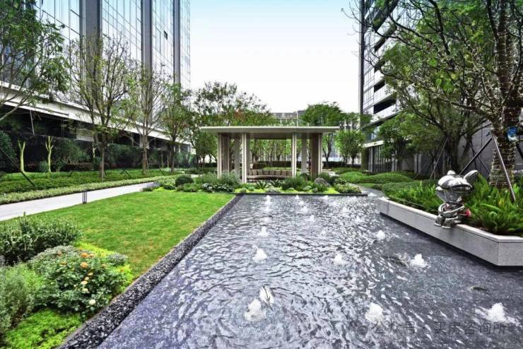 园林——采用立体抬高式,约3.8万㎡,带400m跑道,配置泳池和竹木地面放松休闲区,在小区内营造轻松的氛围。
