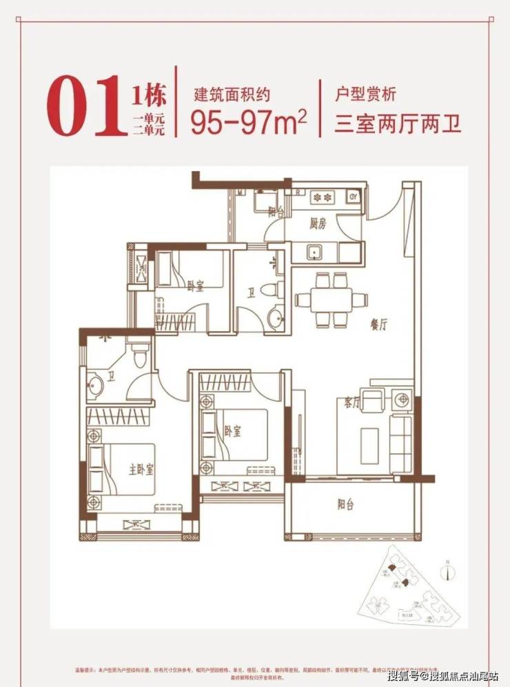 约95-97㎡三房:南向端头位,三面采光,花园瞰景。