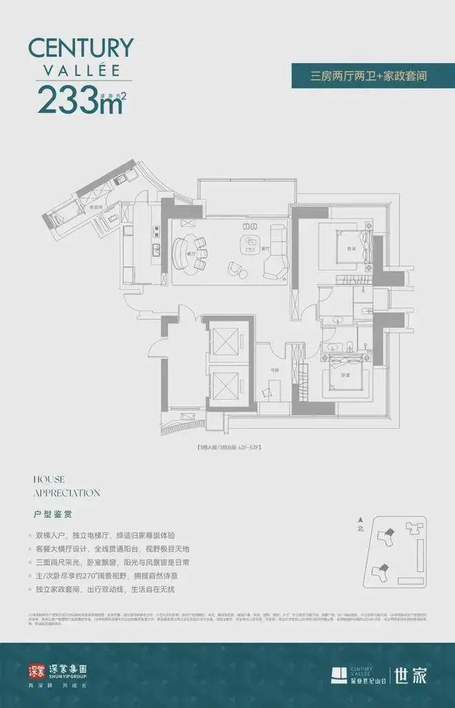 深业世纪山谷·世家主推建面约233/280/386m²纯粹大平层户型,高区还有少量建面约420-1080㎡墅级顶复。
