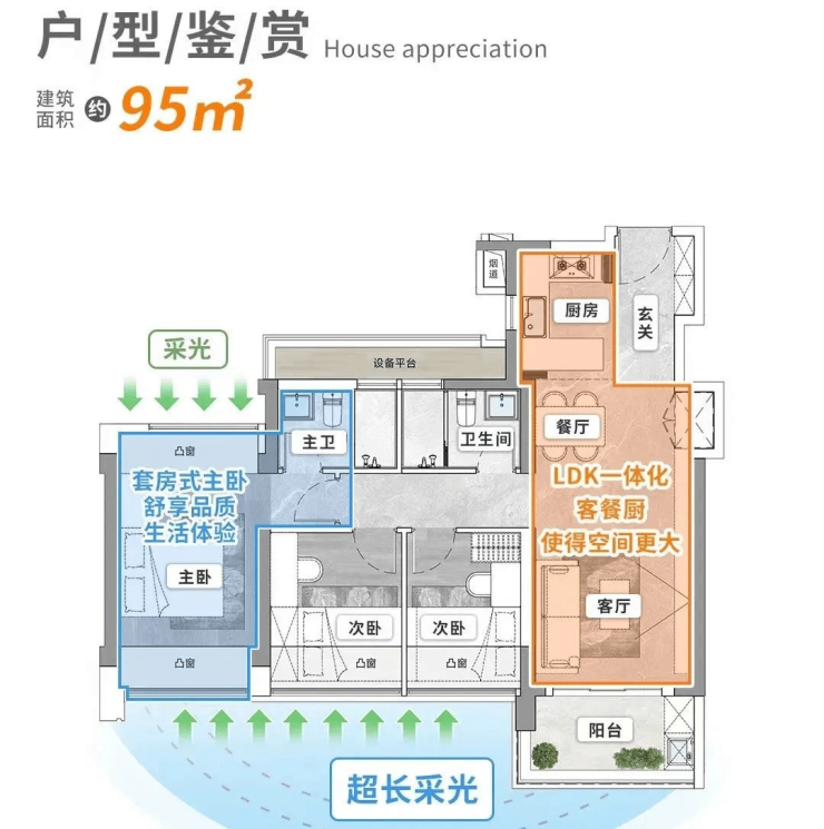 特点:片区唯一百平以下四房,南向超大设备平台可改收纳或卧室,主卫扩容3㎡