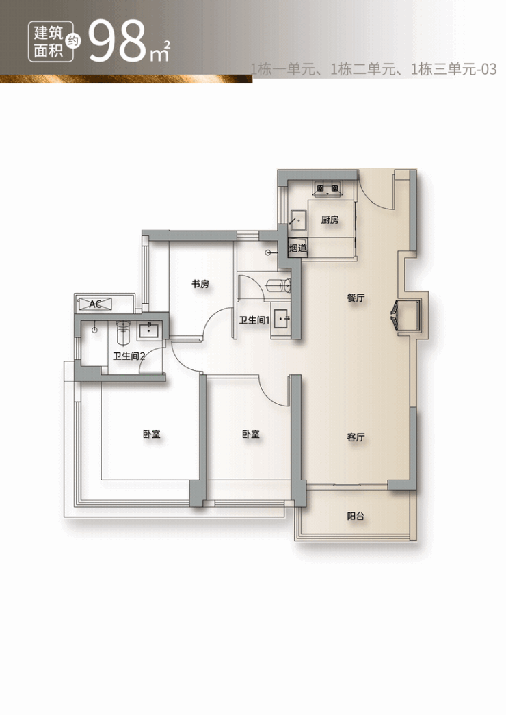 建面约98㎡3房2卫,适合追求尺度的家庭。