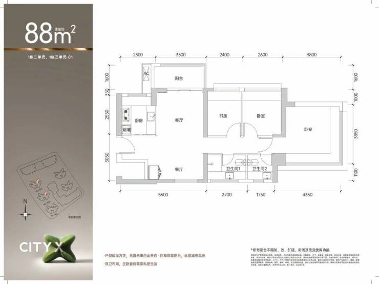 88平户型,南北通透的双厅设计,不论楼层高低通风采光视野均非常舒适通透,适合三口之家从容生活。