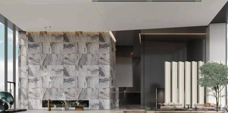 大堂及接待中心,将建筑带入艺术创造的纯粹境界,选用古奇黑石材为接待台,配以大面积的石材上墙,于10.2米的极致挑高中,将线条与空间相融,融合湾海意境,使其层次分明兼具连续性且更有韵律感,在城市肌理脱颖而出,提升整体的空间质量。