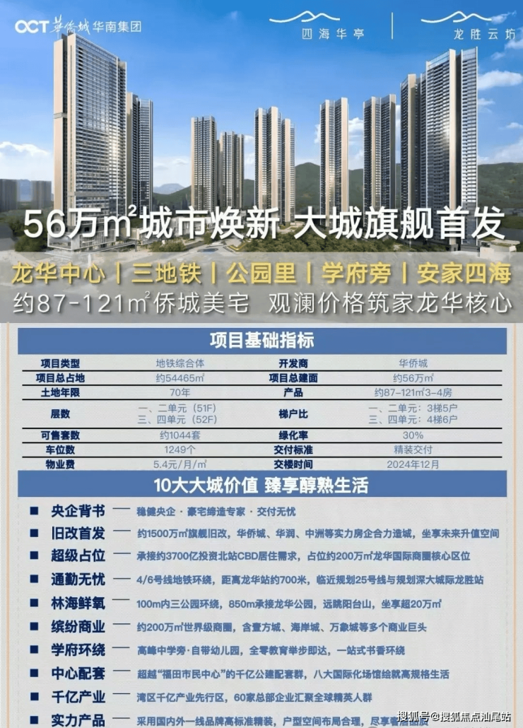 华侨城四海华亭是华侨城集团在深圳龙华区大浪街道开发的大型城市更新项目,前身为“龙胜村旧改单元”,总占地面积约5.45万㎡,总建筑面积约56万㎡,涵盖住宅、公寓、商业、教育等复合业态,定位为“生态大城综合体”。