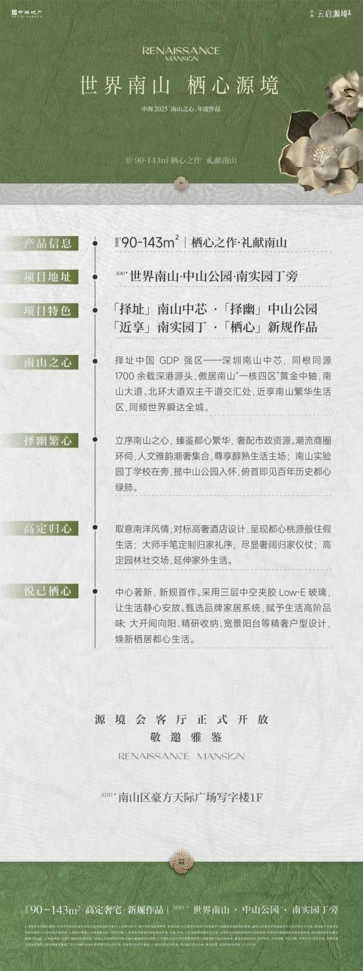 🌳中央公园住区——择幽而栖:项目位于都心静谧的中央公园住区,近邻百年中山公园,拥览约 49 万㎡城央绿肺,占据稀缺的自然资源与景观盛境。(数据来源:孙中山故居纪念馆官网)📒人文菁英高地——优教同源:项目旁即为南实园丁学校,同源南山实验集团优教资源。片区内坐落南实麒麟、深圳艺术学校等优质学校,优教氛围浓厚。🛍漫享精奢烟火——繁华奢境:项目所在南山中芯醇熟生活圈,奢配市政资源,潮流商圈环同,可达前海山姆旗舰店、壹方城、万象前海、壹方汇等购物中心。