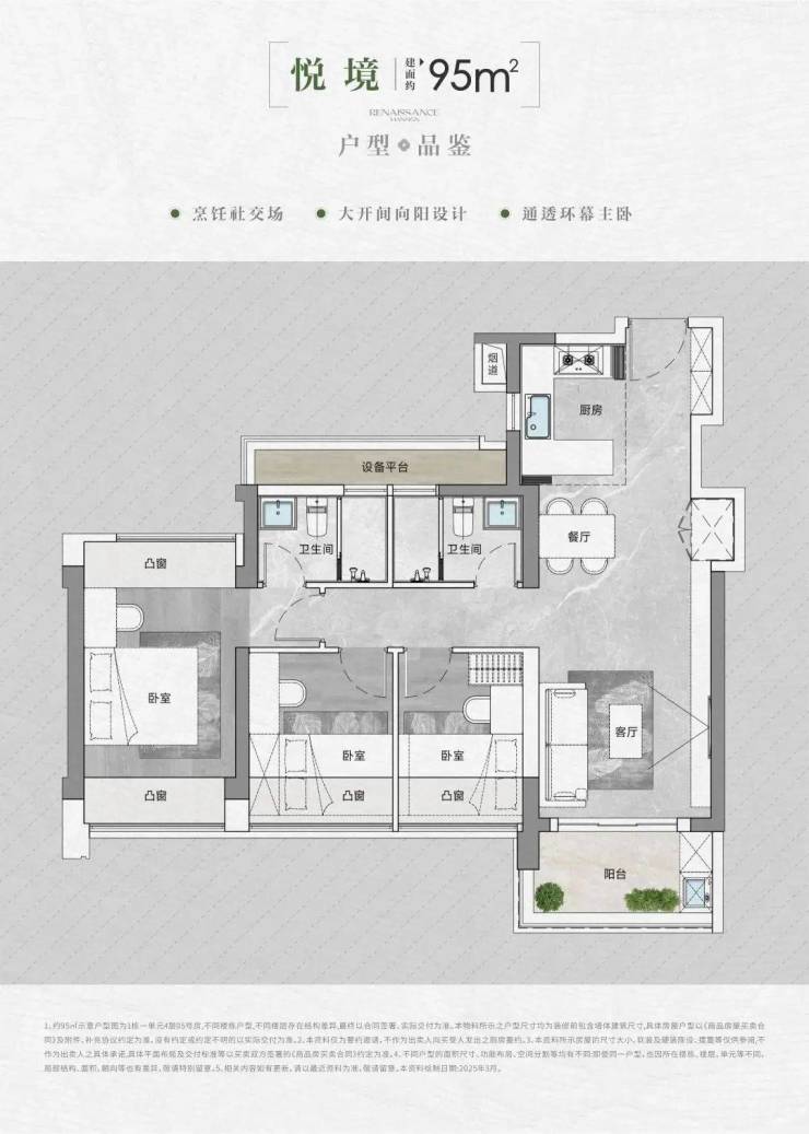 • 得房率:通过创新性的飘窗、双阳台改造、设备平台赠送等设计,实现平均94-96%的惊人得房率。