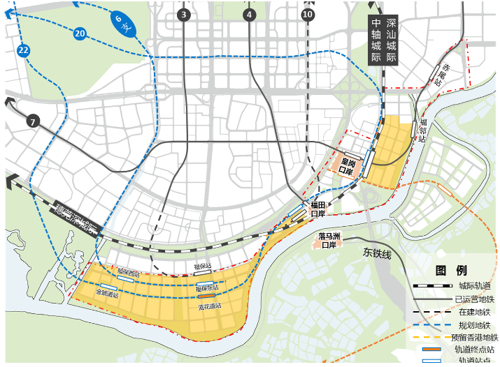完善区域对外交通网络。研究引入穗莞深等城际铁路,加快深圳城市轨道交通6号线支线进一步南延至深圳园区等项目建设;推进皇岗路提升改造和新洲路南延工程等。积极配合香港研究北环线支线接入新皇岗口岸的可行性。