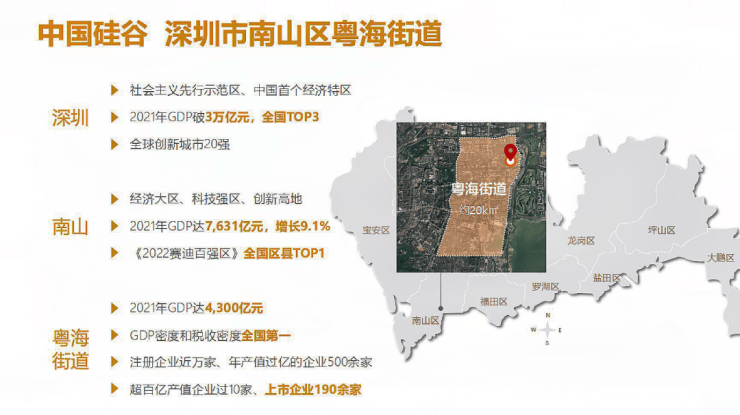 其中粤海街道面积约20k㎡,GDP密度和税收密度全国第一,上市企业200余家,经济、科创活力旺盛。