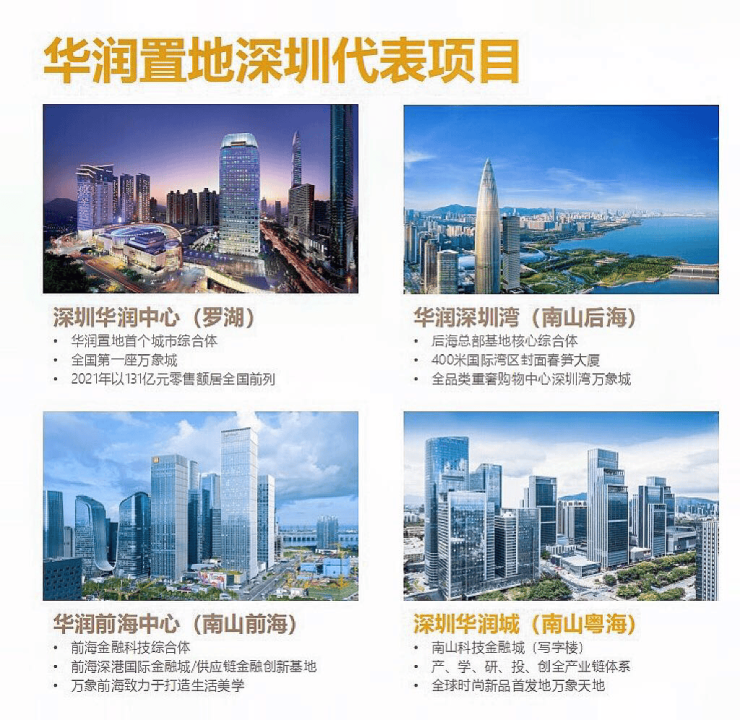 华润置地是华润集团旗下的地产业务旗舰,内地最具实力的综合地产开发商之一,中国商业地产第一品牌,在深代表综合体项目有深圳华润中心、深圳华润城、华润深圳湾、华润前海中心等。
