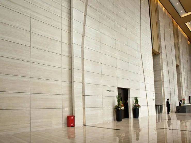 大堂宽敞明亮、气势磅礴,米白色的木纹石墙面与地面相容,简洁大方。别具特色的服务台在宽敞的大厅里特别吸引人眼球,其中高贵优雅的白玉石插入在黑色的花岗石中非常醒目,更特别的是其设计超越以往的规则束缚,正侧面都是由简单的不在同一平面上的三角形组合而成,突显出线面的组合美,给人立体感,既简单却又不乏艺术美,与众不同。